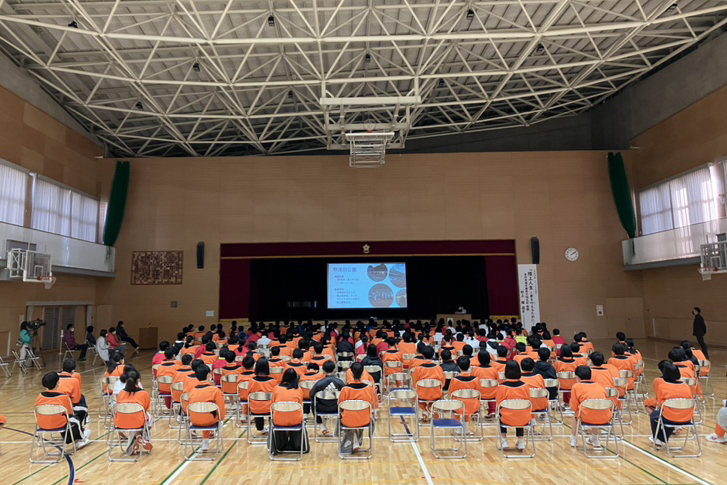 前半の講演では、全日本選手権男子砲丸投優勝や国体で三重県選手団の旗手を務めた経験について紹介。また、砲丸投との出会いや学生時代の歩み、日々のトレーニングの紹介を通じて、生徒へメッセージを送りました。