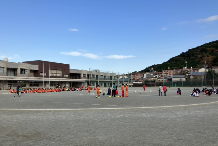 前半は、体育館で全生徒216人を前に、スライドを投影しながら約1時間の講演を行い、後半はグラウンドに出て、実技を披露しました。