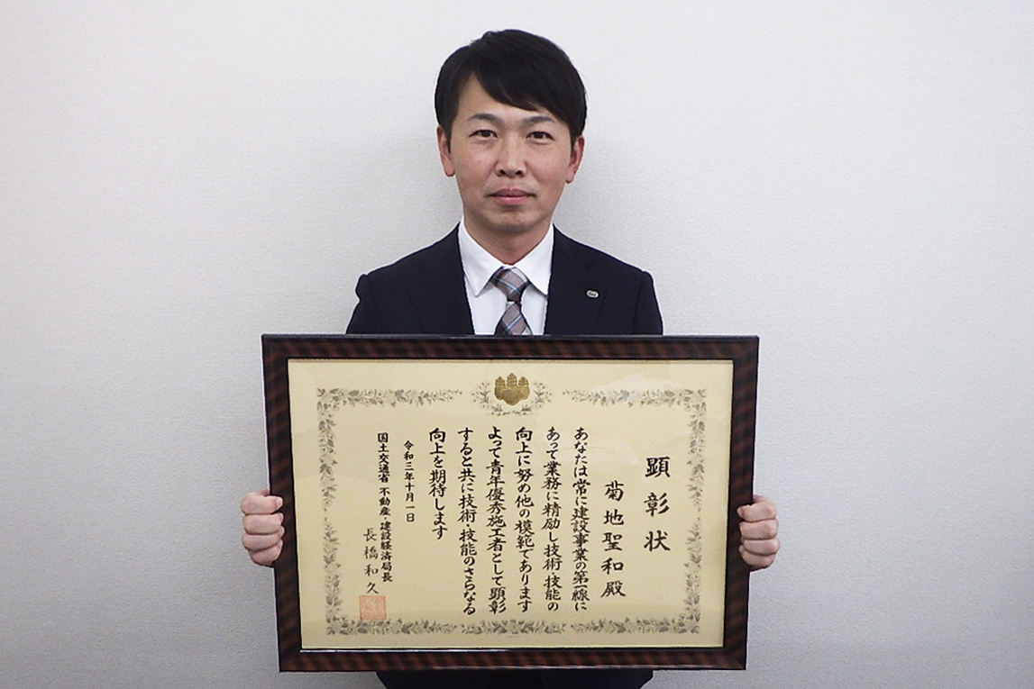 当社職員の菊地聖和が2021年度『青年優秀施工者不動産・建設経済局長顕彰(建設ジュニアマスター)』を受賞し、顕彰状が授与されました。