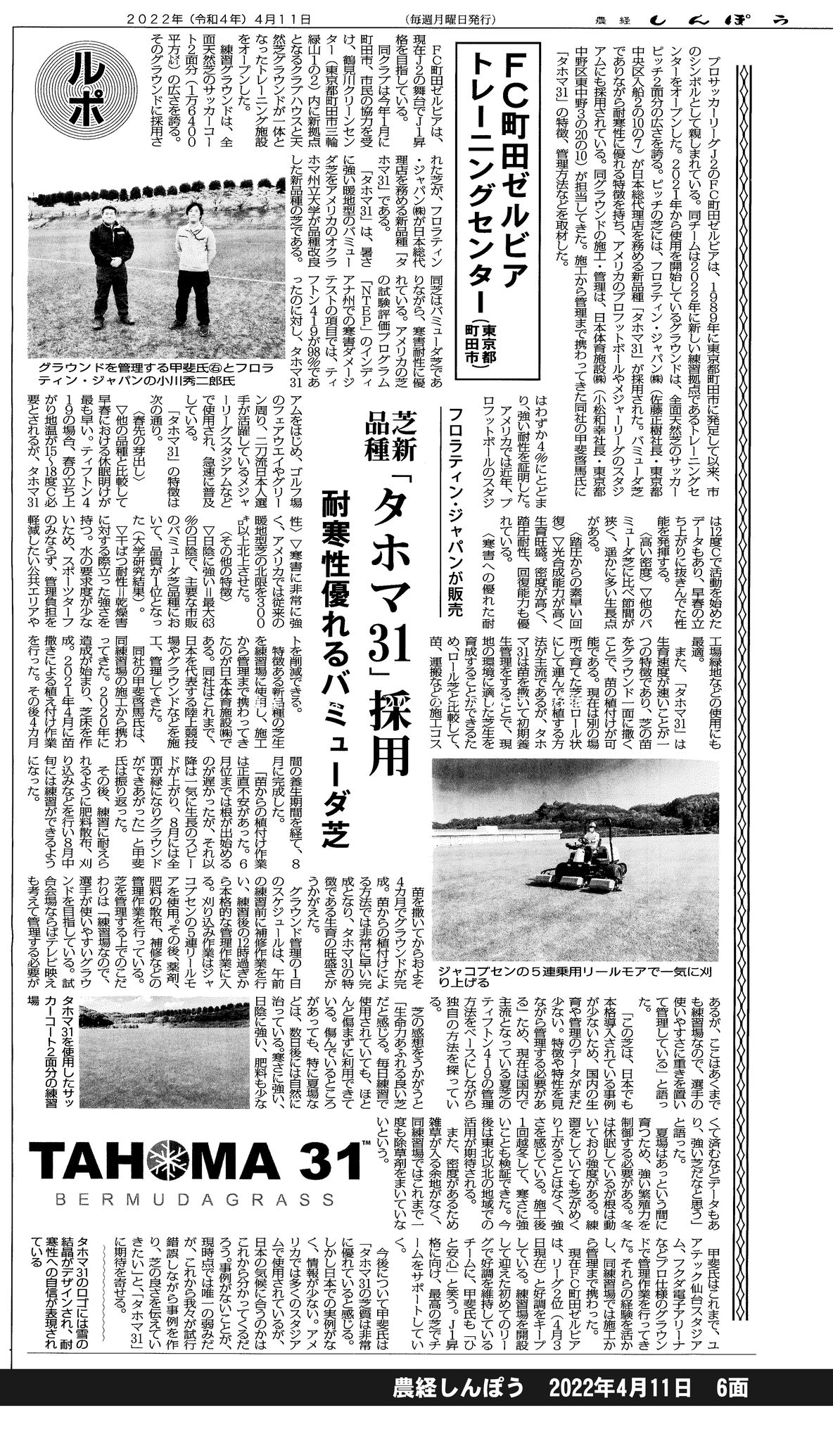 農業や施設、資材、技術に関するアグリビジネス全般の最新ニュースを掲載する「農経しんぽう(2022.04.11.6面)」に、当社でグラウンドの施工と芝生管理を行うFC町田ゼルビア練習場の三輪緑山ベースで導入した『タホマ31』についての記事が掲載されました。