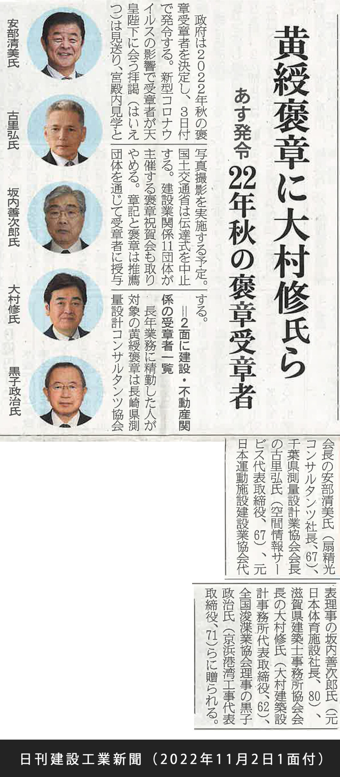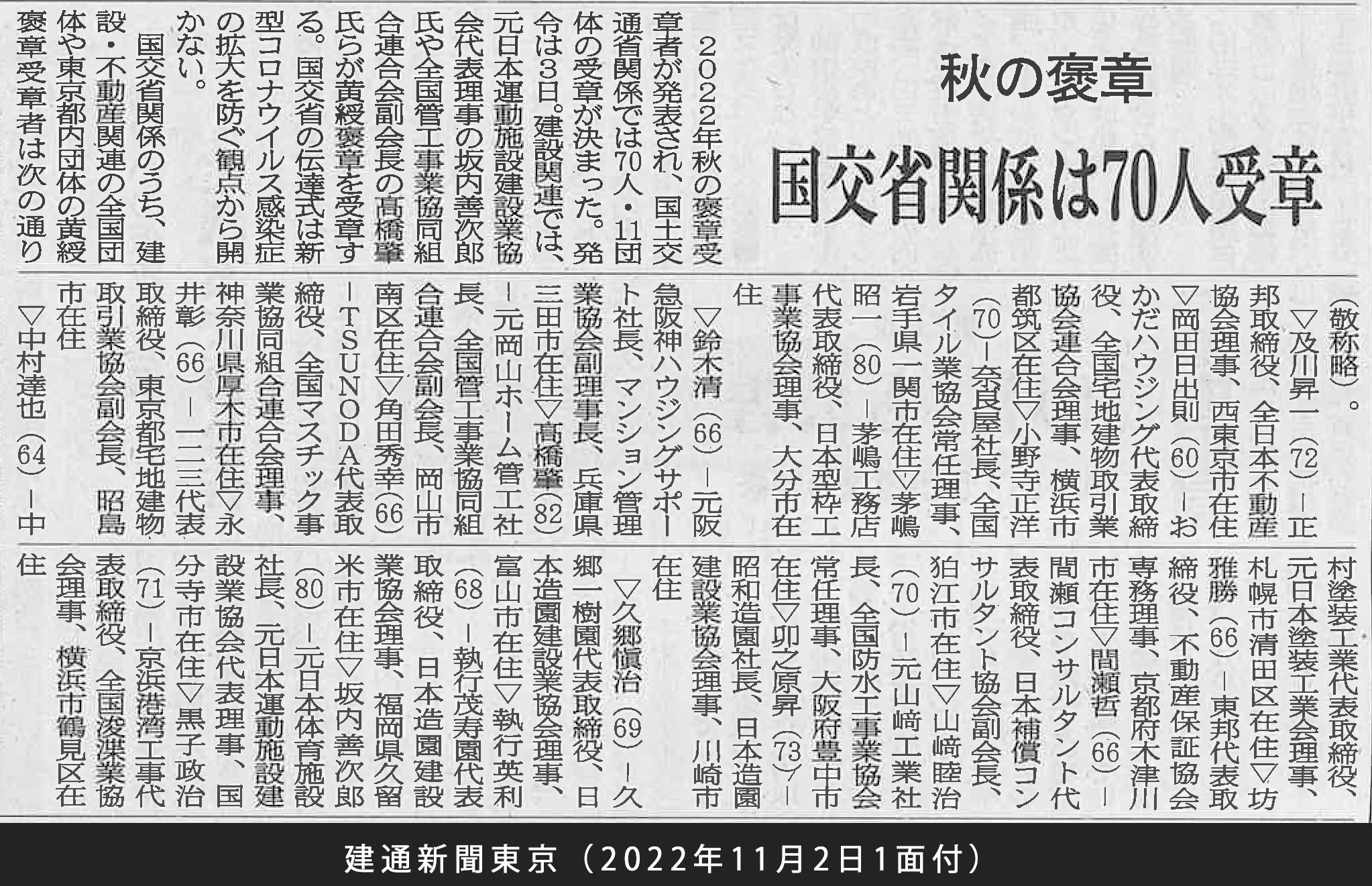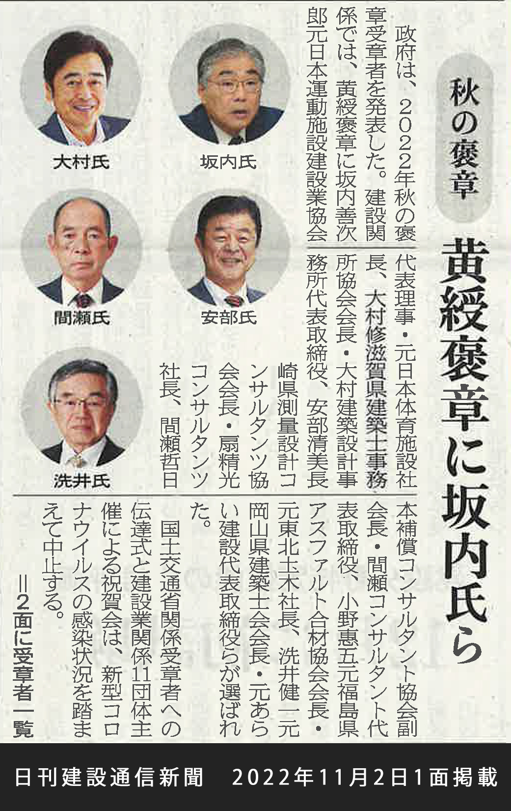 坂内相談役の黄綬褒章の受賞は、日刊建設工業新聞や日刊建設通信新聞、建通新聞東京に掲載されました。