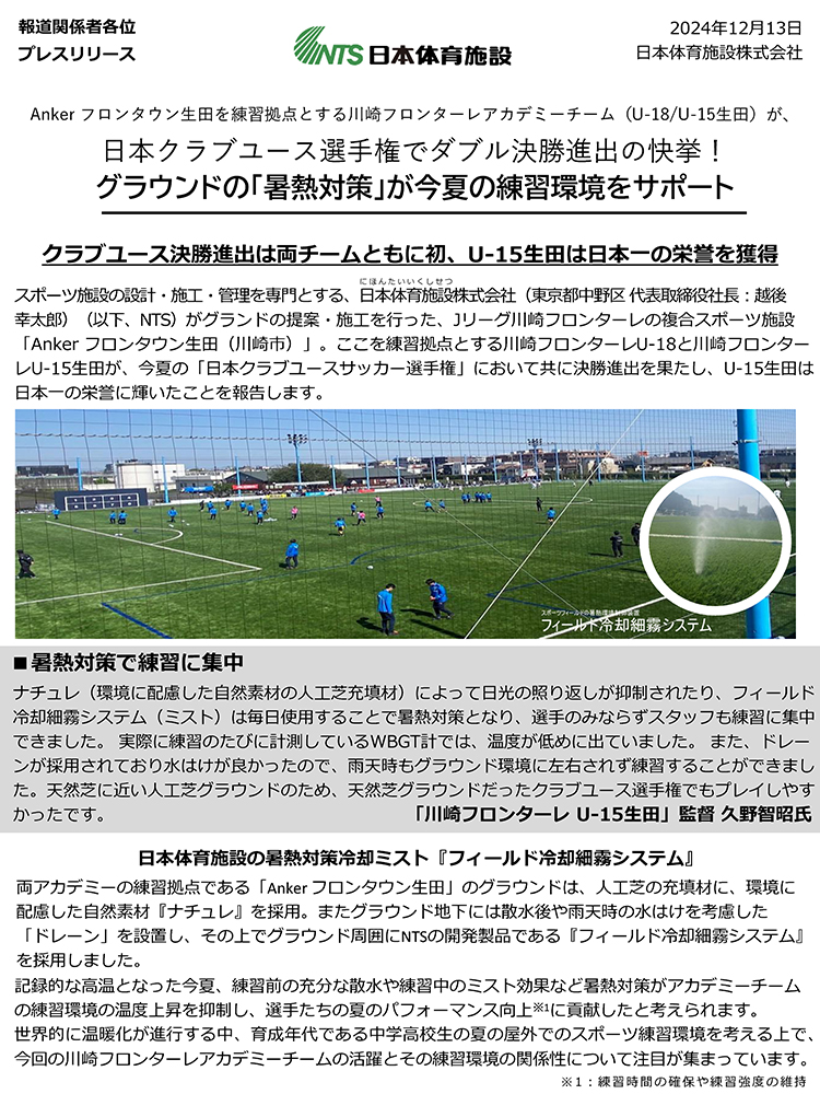 12月13日(金)、川崎フロンターレアカデミーチームの躍進に貢献したAnker フロンタウン生田サッカーグラウンドの暑熱対策について、プレスリリースを配信しました。