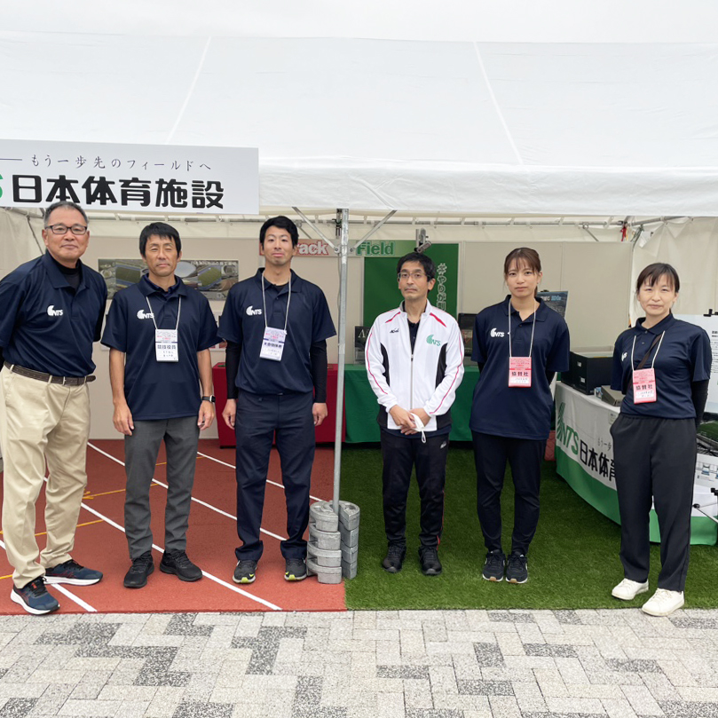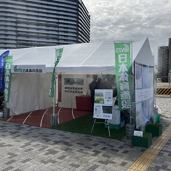ブースに1/2サイズのリレーゾーンを再現。展示は、陸上競技「Track & field」をテーマに、「Track」では『陸上トラックができるまで』をイメージボードやサンプルで展示し、「field」では『やりが刺さる人工芝』や『熱中症対策ミスト』、『日本体育施設が取り組むSDGs』についてを展示しました。