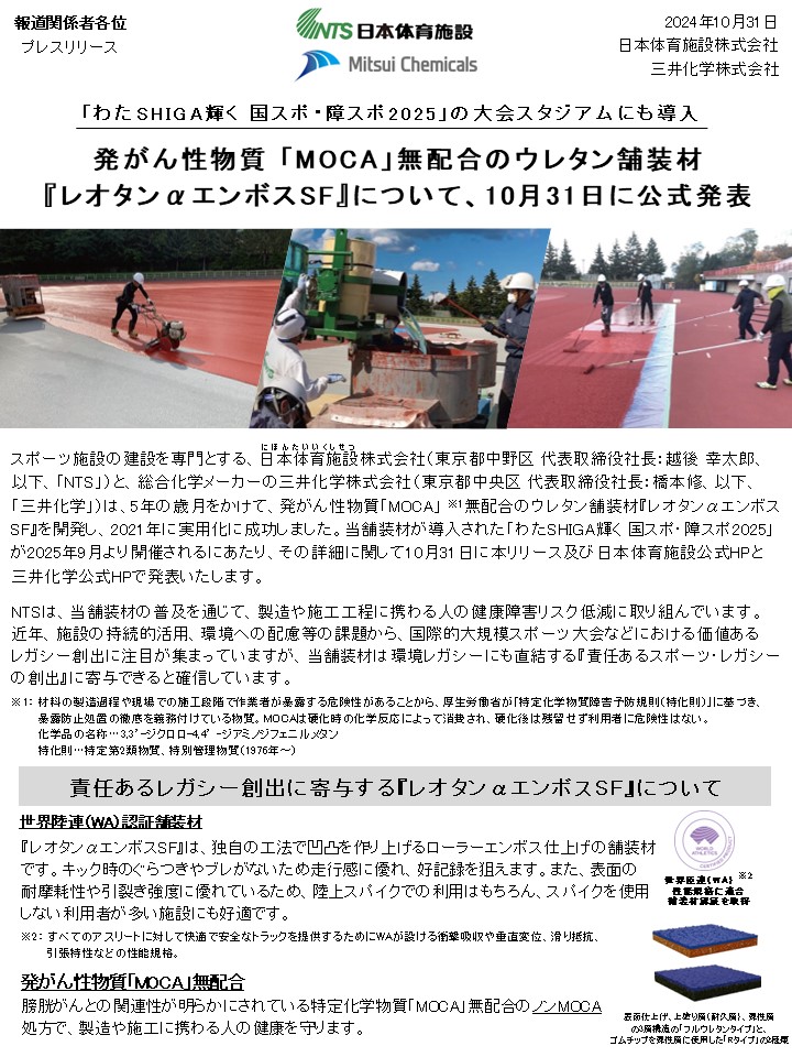 10月31日(木)日本体育施設株式会社と三井化学株式会社は、わたSHIGA輝く国スポ・障スポの会場で採用された環境対応型ウレタン舗装材『レオタンαエンボスSF』について連名でニュースリリースを配信しました。