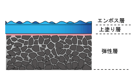 『レオタンαエンボス』Rタイプは、弾性のあるゴムチップ層の上に、陸上スパイクへ耐久力を発揮するウレタン層を重ね、表面にはローラーエンボス仕上げを採用した複合弾性舗装です。