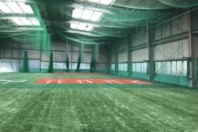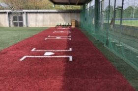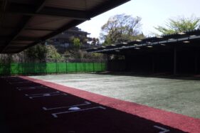このリニューアル工事では、安部球場の既存人工芝をロール状に巻き取って移設し、ラインを新たに設置して、投手練習場を整備しました。また、室内練習場は人工芝の張替えと防球ネットの整備を行いました。