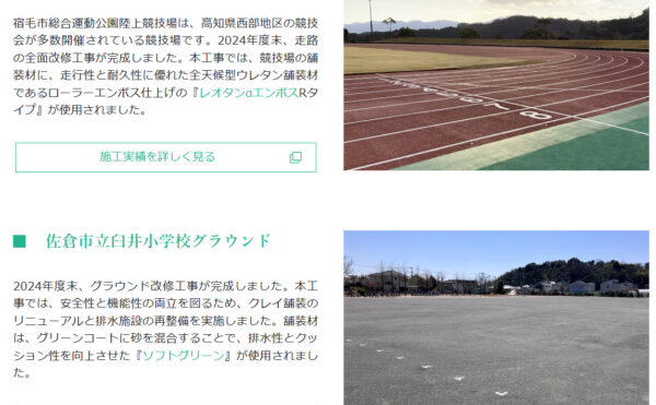 走路の全面改修工事やソフトグリーン舗装を導入 当社が施工を担当した宿毛市総合運動公園陸上競技場(高知県)、佐倉市立臼井小学校グラウンド(千葉県)の施工実績情報を公開しました。
