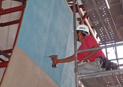 ボルダリングの施設では、当然ですが壁面の施工が必要になります。体重、ひいてはプレイヤーの安全を預かるホールド(石)の埋め込みや、クライミングボード(壁面)の堅牢な施工には細心の注意と技術力が必須です。日本体育施設では、多くのスポーツ施設の施工経験を活かし、ボルダリング施設の工事を請け負っています。