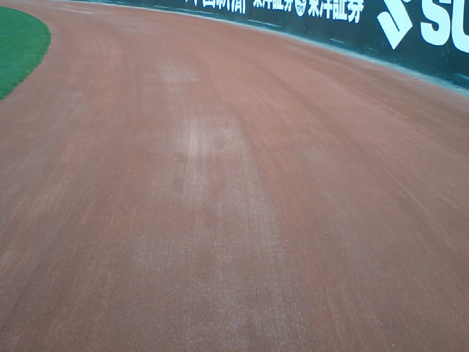 野球場の内野やベース周りには、しばしばクレイ舗装が採用されます。 一般的なのは黒土混合土舗装ですが、排水性や色彩感を重視して、 アンツーカ舗装が選定されることもあります。 また、外野フェンスに沿って設置されるウォーニングゾーンをアンツーカ舗装にする例もあります。