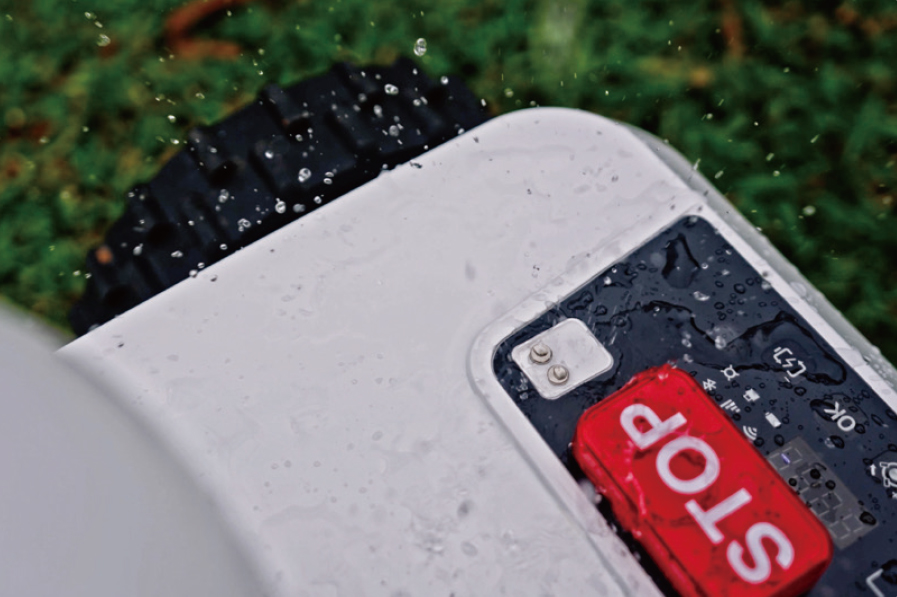 『FR4000』は、雨センサーを搭載しており、降雨を検知すると自動で芝刈り作業を一時停止し、自走して保全エリアへ待避する設計となっています。また、 IPX5防水仕様により、『FR4000』を水の侵入による故障から守ります。