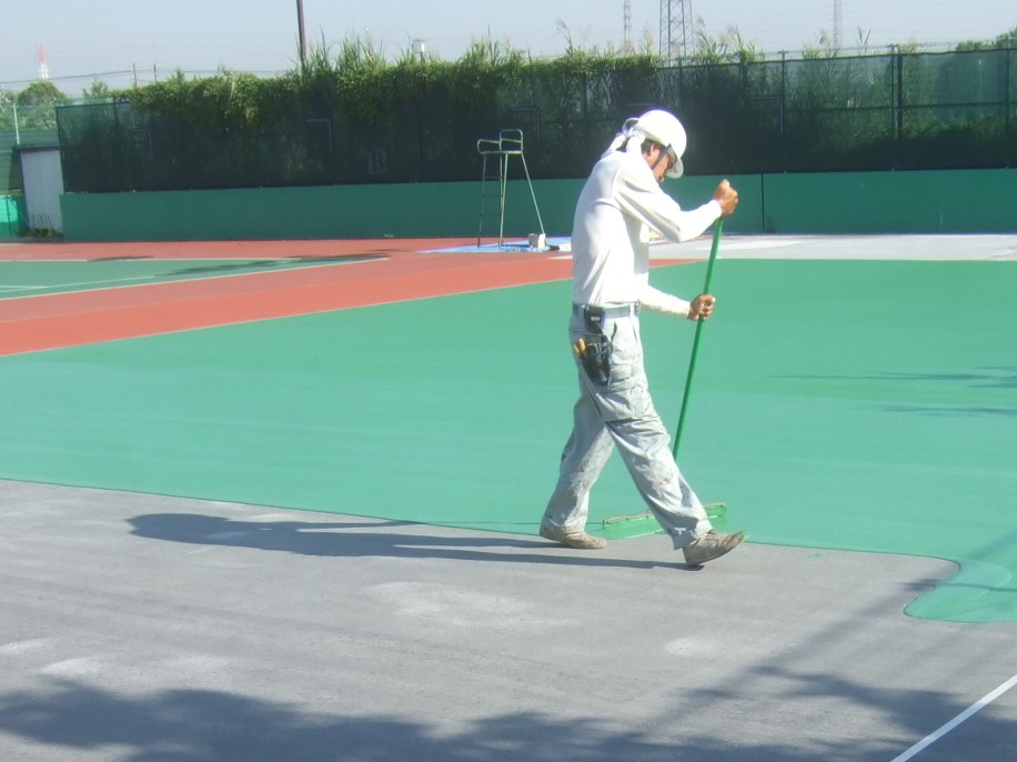わずか数ミリの表層部に、必要な滑りや弾性を持たせる細やか施工です。全層を塗布し終えた後、ラインを引き、ネット等を設置すれば完了です。