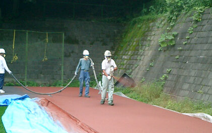 そして、最表層部を仕上げます。 『レオタンJ』は、ウレタンを吹き付けて施工します。 この時、ウレタン樹脂をべた塗りにしてしまうと、透水機能が失われてしまいますので、 絵画の点描(=stipple)技法に通ずる手法を採用します。 このことから、『レオタンJ』の表層仕上げを「スティップル仕上げ」と呼んでいます。