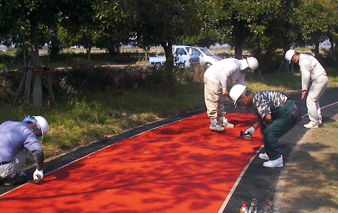 また、全天候型ゴムチップ舗装、ゴムチップウレタン舗装は、クッション性が高く衝撃吸収力に優れているため、歩行や走行者への足腰への負担を軽減します。