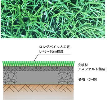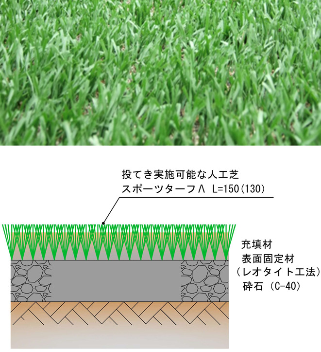 陸上競技場の多目的利用を実現するために開発。砂や細粒ゴムチップを充填し、天然芝の構造に近い。衝撃吸収性を高めるため下地には砕石路盤を採用。パイル長は130mmまたは150㎜(充填厚t=100mmまたは120mm)。