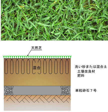 通年利用を想定すると、関東以南の地域では暖地型芝を主体にウィンターオーバーシードにより常緑を維持する施設が見られます。このような施設では排水性を重視して、芝床に洗い砂または混合土を300mm程度、路盤には単粒砕石を使用する構造になっています。