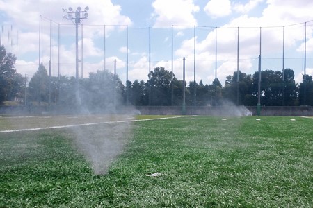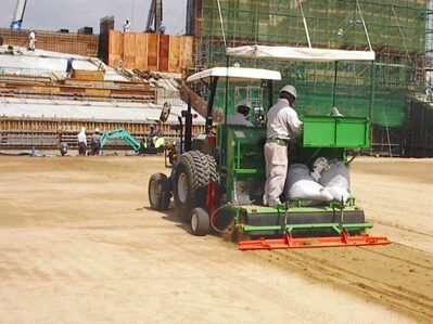 また、短期間でターフを形成するために、ティフトン芝の苗を現場で植え付ける『機械まき芝工法』を採用。 育成管理された圃場から切り出した芝を、洗浄・殺菌し、芝苗の鮮度を重視して施工しました。