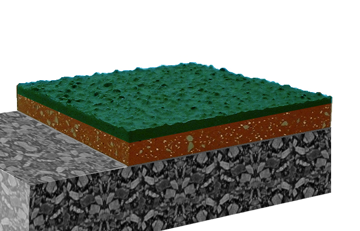 弾性層(赤色)の敷設後に、カラーリング部分の上塗り層、エンボス層を敷設、トップコートを塗布して仕上げます。