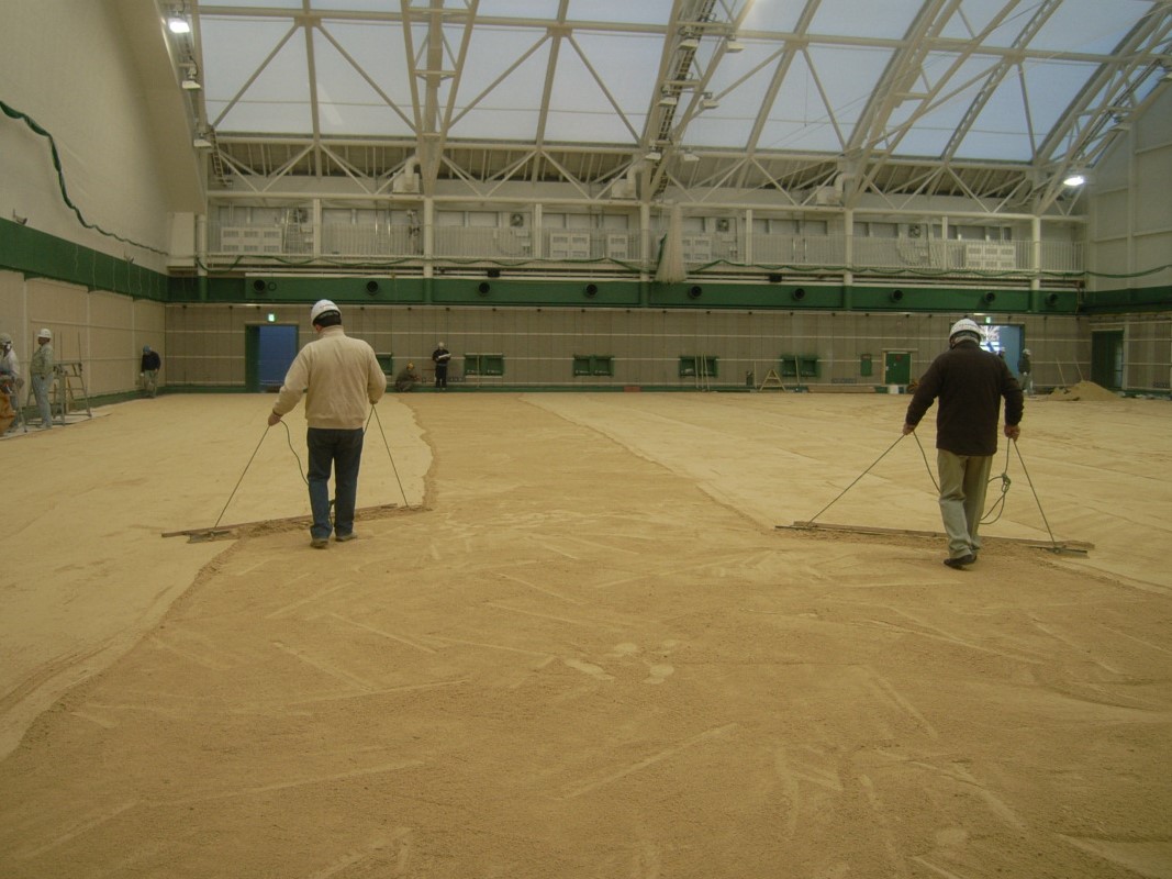 平坦性を実現するためには、入念な施工管理が欠かせません。 幾度に渡って測量を行い、丁寧に不陸(ふりく:地面が凸凹していること)を整正します。