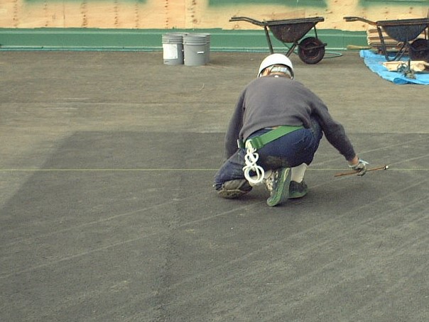 それだけでなく、下地アスファルトの施工にあたっても、技術的工夫を取り入れます。 テニスコート一面の面積は、コートの外側を含めても約560㎡で、コート内だけでは、わずか260㎡程しかありませんが、 高性能なコートづくりのため、センサーを利用したフィニッシャー施工を導入することが多くなっています。