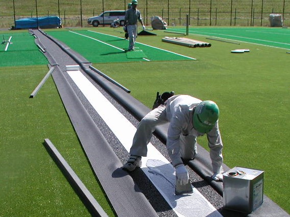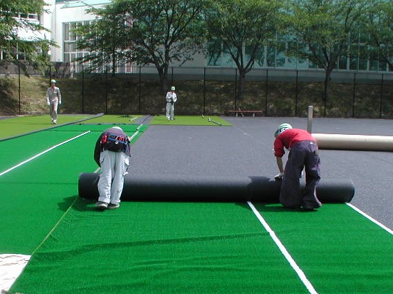 はじめに、下地となる路盤、アスファルト層を舗装します。ハードコート同様に、表層部での不陸整正は困難なので、下地で充分な平坦性を確保します。また、適切な表面勾配を確保することにより、排水効率を向上させます。
