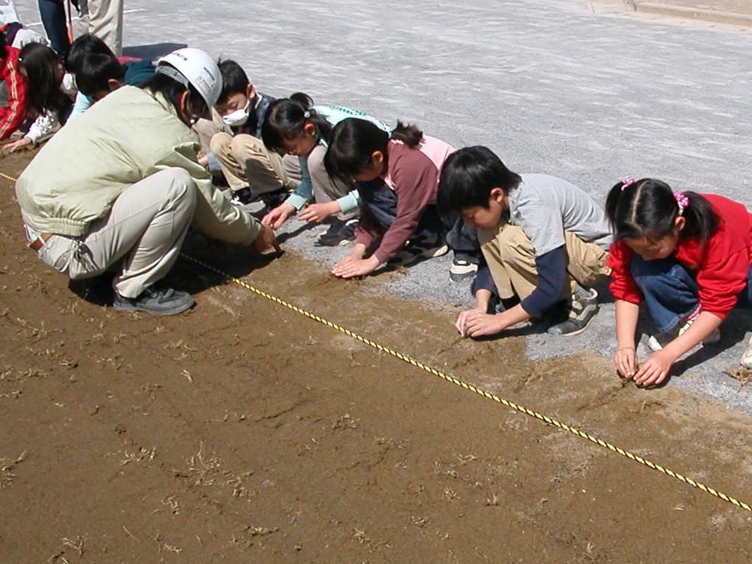このほか、施工時に芝苗の植え付けなど、作業の一部を生徒たちと共にに行うことが可能です。 芝の成長過程をみんなで見守っていければ、植物や生物に対する関心を高めてもらえるでしょう。生きている芝生と日々接することにより、環境教育上の効果も期待できます。芝生そのものを、体験学習の教材として利用することも可能です。