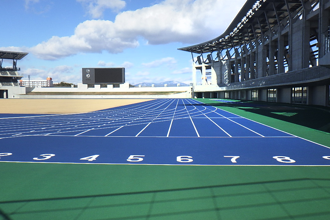 世界陸連(WA)クラス2認証の陸上競技場。香川丸亀国際ハーフマラソンのスタート・ゴール地点。走路、助走路と半円部のウレタン舗装に『レオタンαエンボスSF』を採用。