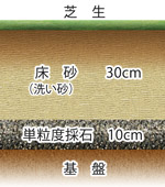 『スポーツターフ』は、一般的な芝生広場やゴルフ場とは異なる環境条件下に置かれる特殊な芝生ですので、専門的見地に立った構造を採用します。その「特殊性」とは、例えば以下の点です。