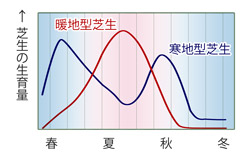 ひとつは暖地型、もうひとつが寒地型です。四季のある日本では、季節(気温)によって、暖地型と寒地型の生育旺盛期が大きく異なります。