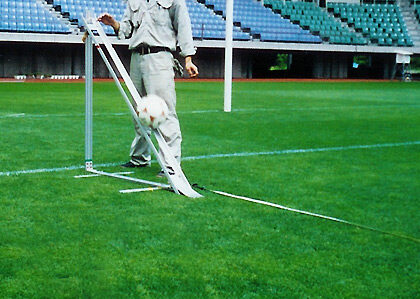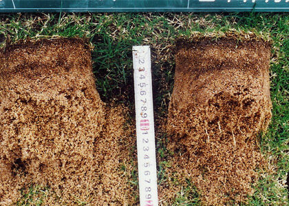 『スポーツターフ』として必要な性能として、競技の踏圧に耐えクッション性が高い、ターフの形成や損傷回復のための成長が早い、一年中緑を保ち美観を保つなどいくつか条件があり、土壌については芝生の生育に適していることや排水性が求められます。