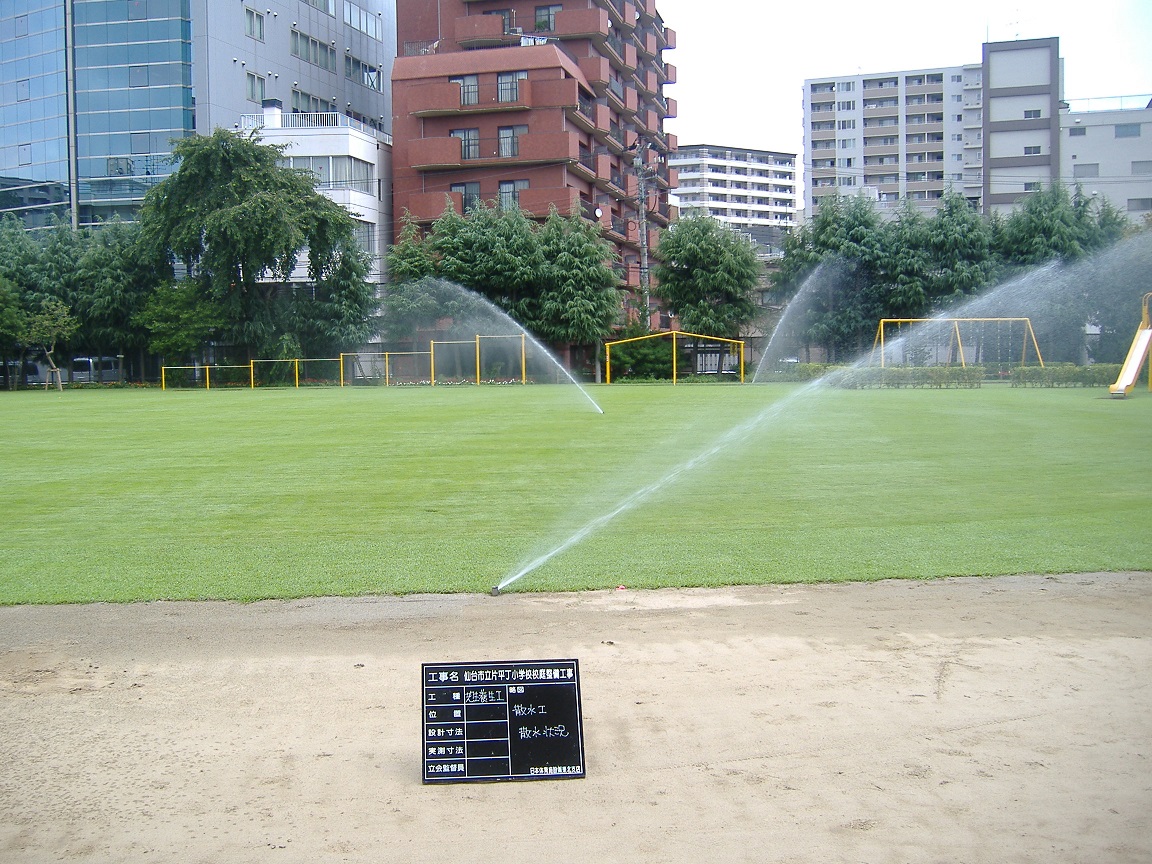 施工範囲:校庭緑化、ゴムチップ舗装、排水設備、散水設備、植栽