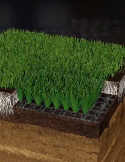 ハイブリッドタイプの芝は、天然芝舗装のプレイ体感に優れた特性と、人工芝の耐久性をあわせ持ちます。使用頻度の高いメガスポーツイベント対応スタジアムなど、多目的な施設利用に対応できると注目のサーフェイスです。