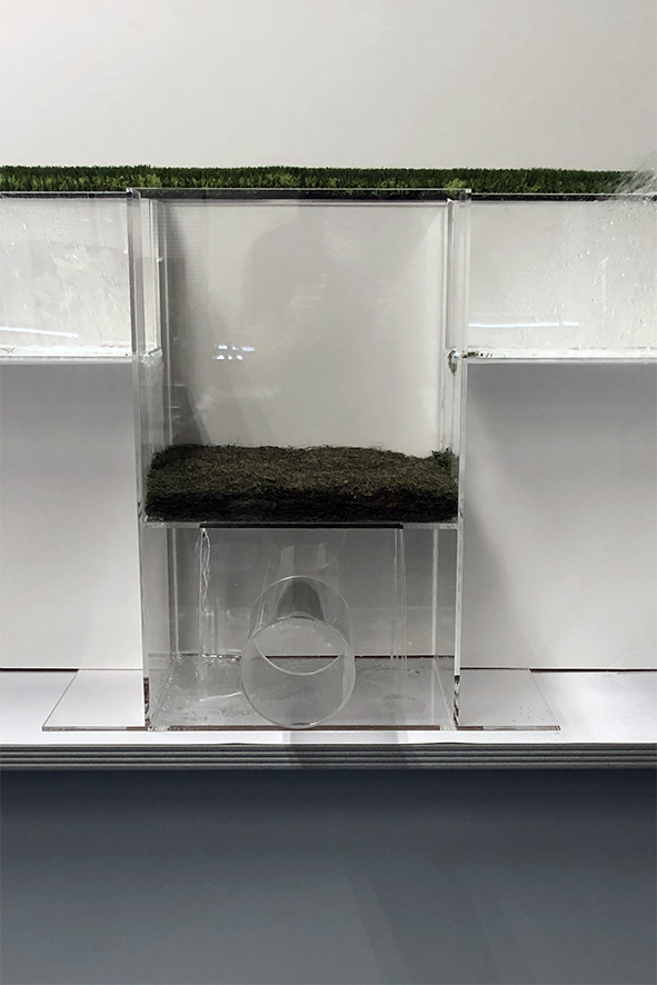 『マイクロプラスチック捕捉集水桝』はちぎれた人工芝やゴムチップ、「マイクロプラスチック」の流出を防ぐ機能を付加する製品です。