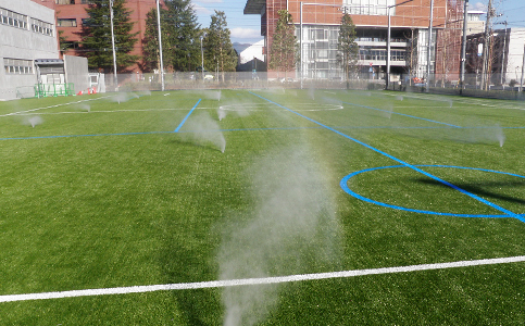 『フィールド冷却細霧システム』はミストを漂わせて太陽熱を遮断。ミスト自体の低温度でフィールドを冷し、気化熱によって周囲の熱を奪います。熱中症が懸念される夏季のプレイ対策にも役立ちます。