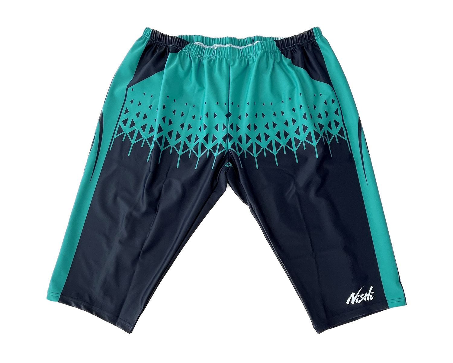 ピーコックグリーンとディープネイビーを組み合わせたグラフィックが特徴的なデザインで、
